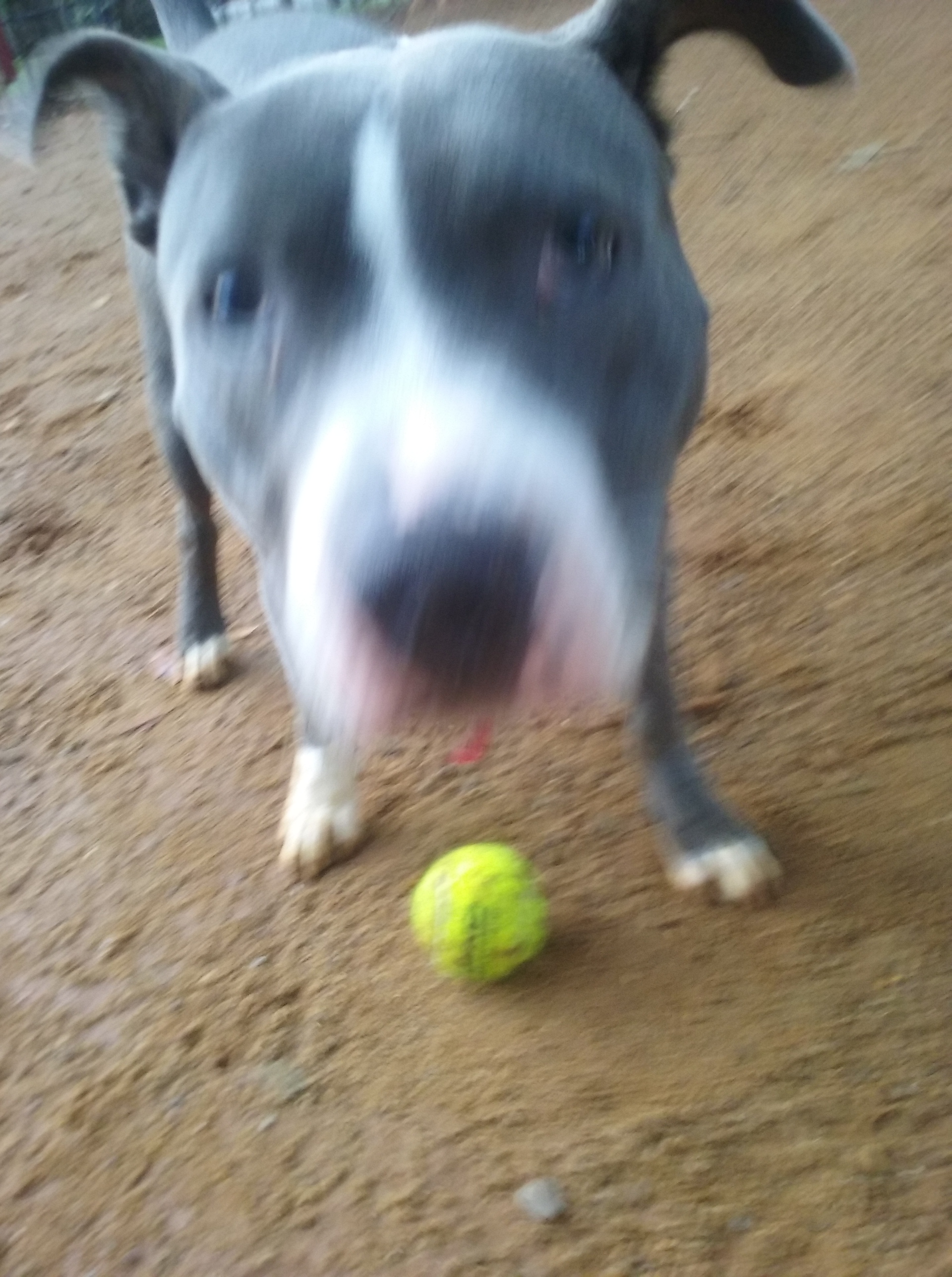 Bafo the Staffy playing with a ball outdoors and looking at the camera